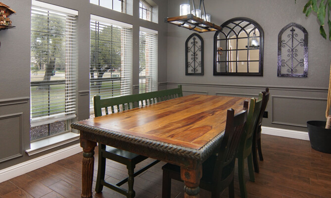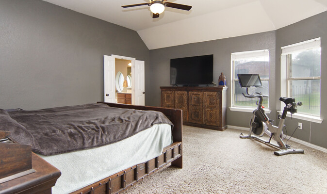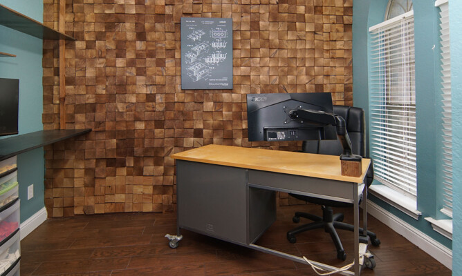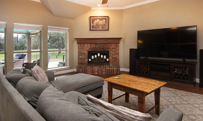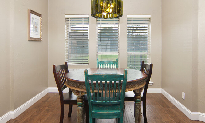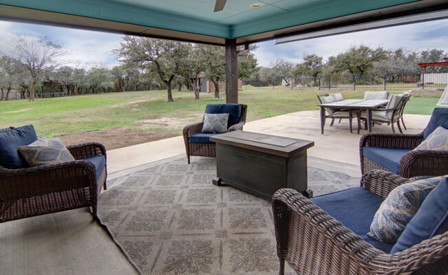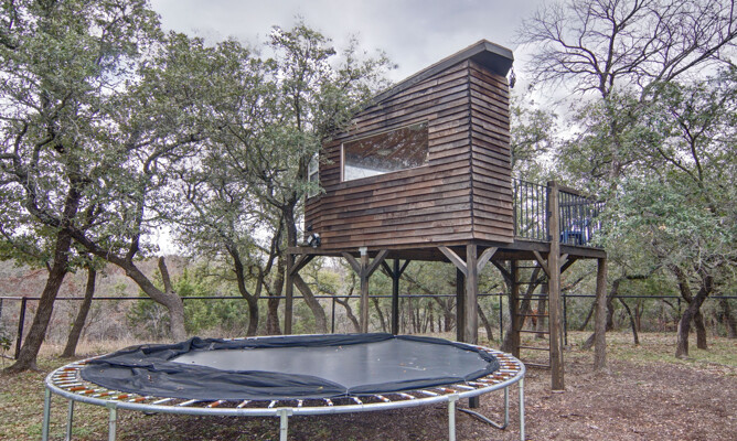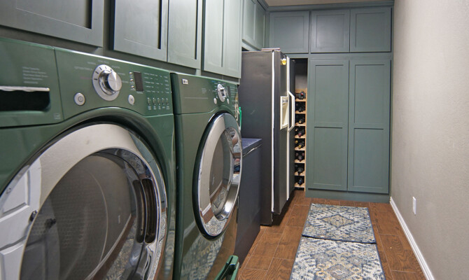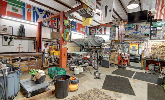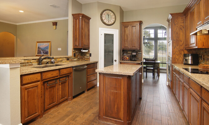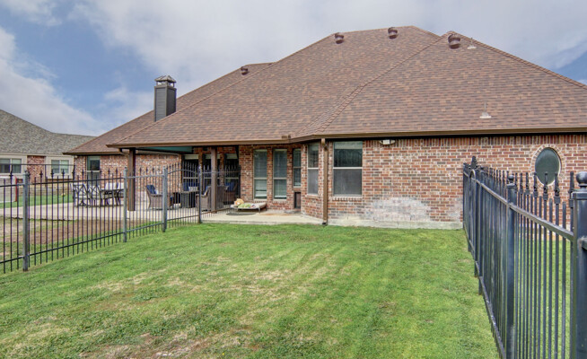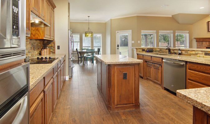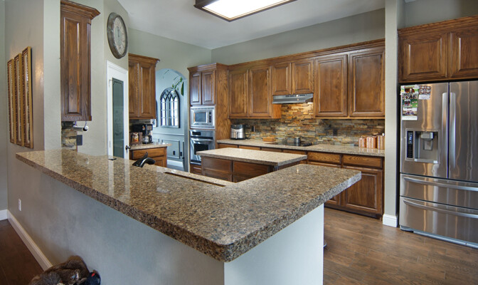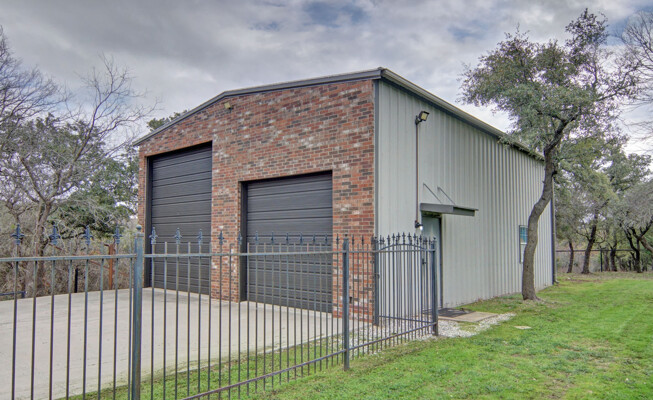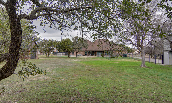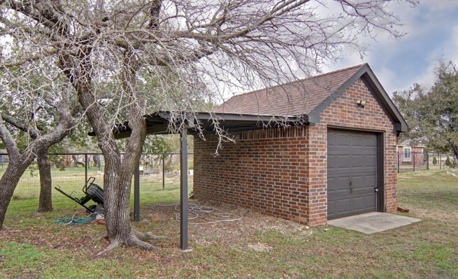 kitchen featuring an expansive island, gleaming quartz countertops, and ample storage, perfect for the culinary enthusiast. Retreat to the luxurious primary bath, which offers a large walk-in shower, jetted tub, and double vanities for a spa-like experience. The thoughtfully designed split-bedroom layout includes a Jack and Jill bath, ensuring privacy and comfort for family and guests alike. The utility room is a dream, providing plenty of cabinet space for all your organizational needs. Outside, the property shines with a generous 40 x 30 shop and an additional 11 x 14 shop, offering plenty of space for all your toys and RV parking. Enjoy the enclosed fenced dog run for your furry friends and let the little ones explore their very own treehouse.